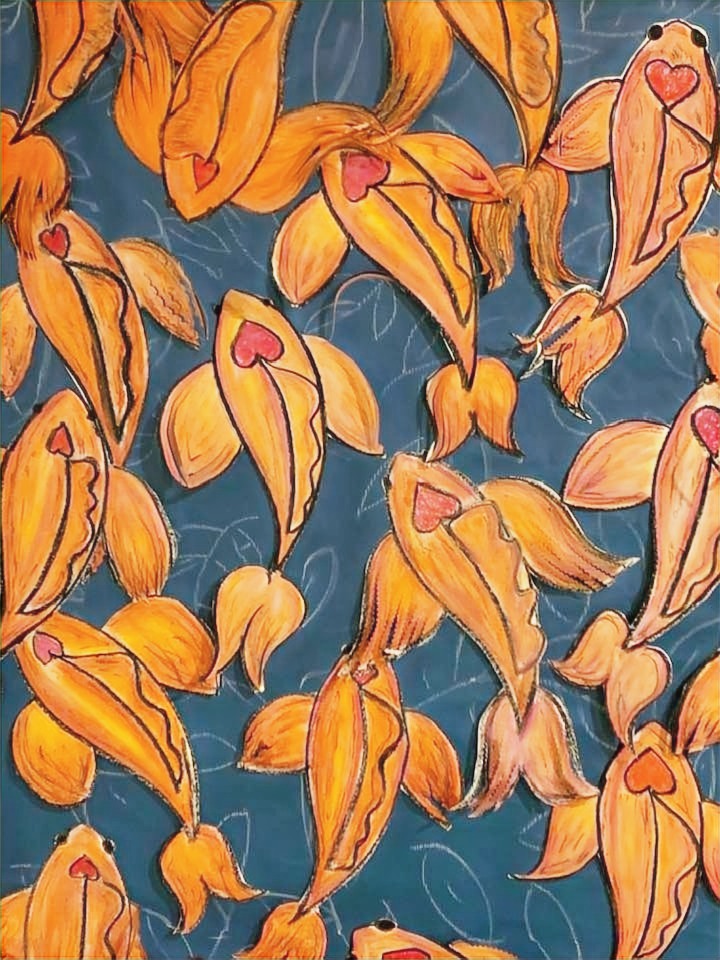 The only drawback to this teaching philosophy is that I end up with 24 finished projects by the end of my teaching week! That's a LOT of art! In the past, I have chosen one for my teacher portfolio; sadly, the rest goes in the waste bin. However, April and May's projects were such that I wondered if there was a way to get more mileage out of my project samples. As I pondered this aloud, one of my students thought of a clever way to display (or recycle) many/most of the sample Koi fish I made in April. She suggested I create a "Koi Fish Pond" on one of my doors in the hallway of my studio! I LOVED it; surprisingly, it took only about 30 minutes to accomplish. As the students arrived for their May lesson, many noticed the "Door Koi pond" and loved it!